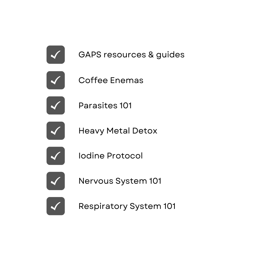 Our membership offers a wealth of educational content and resources, all aligned with the GAPS protocol. From keynote presentations by Monika Holland CGC, CNT, who is a teaching instructor on Dr. Natasha Campbell McBride's Certified Practitioners training, as well as Dr. Becky Plotner, to guides, video resources, and downloadable PDFs, our materials are designed to fully support your health journey.